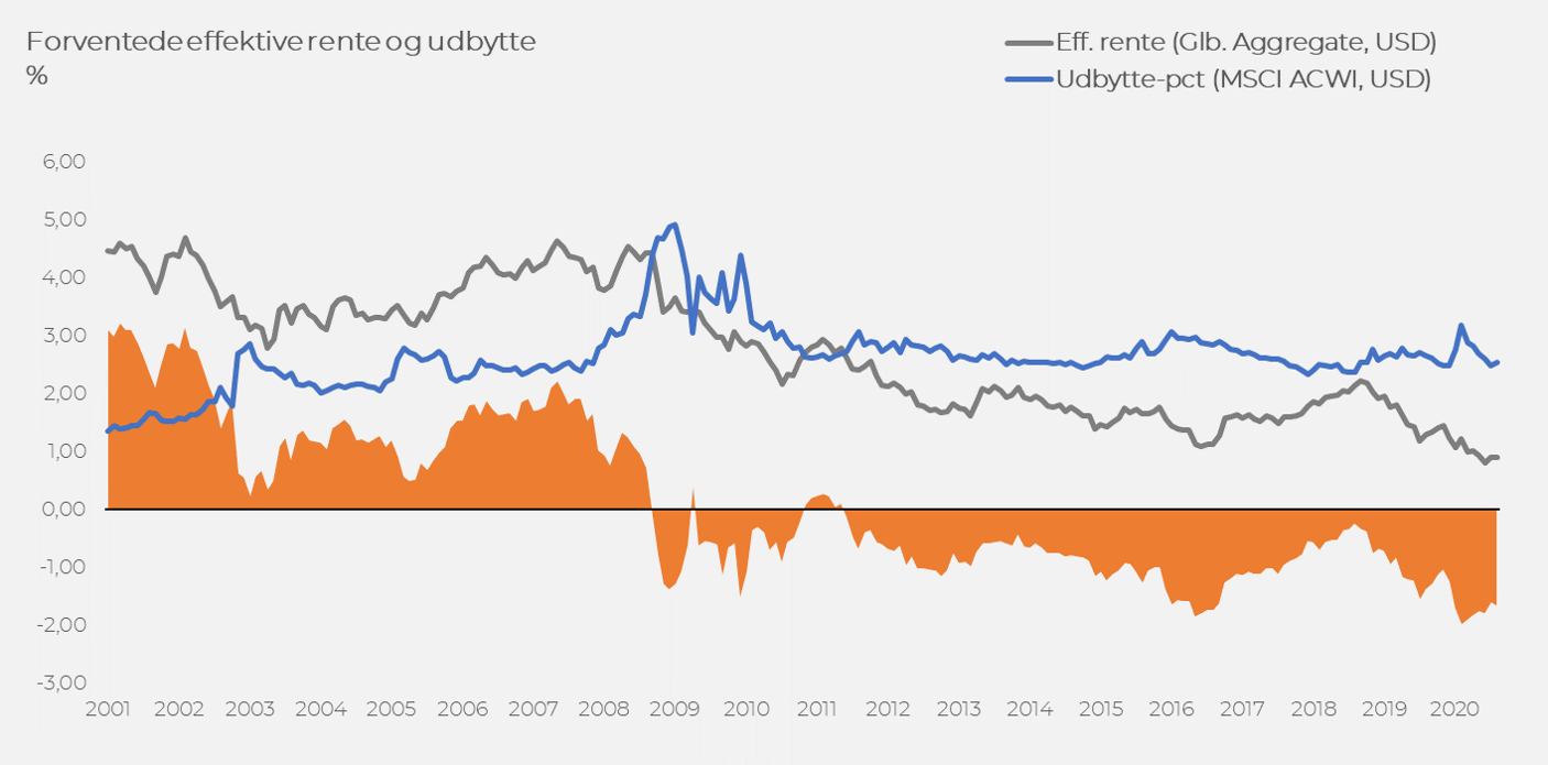 Illustration herunder viser udviklingen i den årlige globale udbytteprocent (blå) sammenholdt med det årlige effektive renteniveau for både stats- og virksomhedsobligationer af høj kreditværdighed (grå). Forskellen mellem de to fremgår i figuren som det skraverede område med orange. Figuren viser, at investorer over en lang periode har haft en ”mer-rente” fra det løbende udbytte fra aktier i forhold til obligationernes løbende effektive rente. Kursudsvingene er naturligvis langt større for aktier end for obligationer, men kan man som investor se igennem de kortsigtede udsving, så vil den langsigtede investor blive belønnet for at vælge aktier fremfor obligationer.