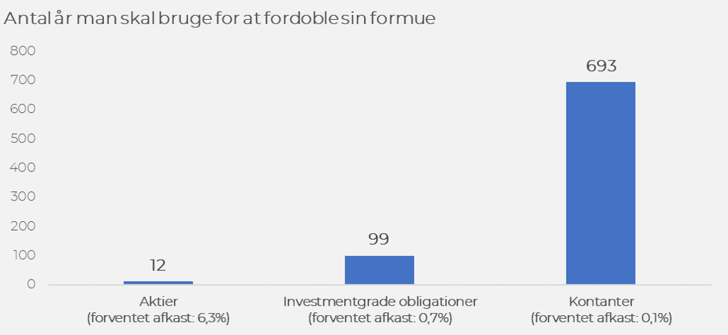 Ved hjælp af simpel matematik kan det beregnes, hvor mange år det tager at fordoble sin investering. Altså, hvor mange år det eksempelvis tager for en investering på 1.000.000 kroner at blive til 2.000.000 kroner, hvis pengene placeres i de forskellige overordnede aktivklasser.