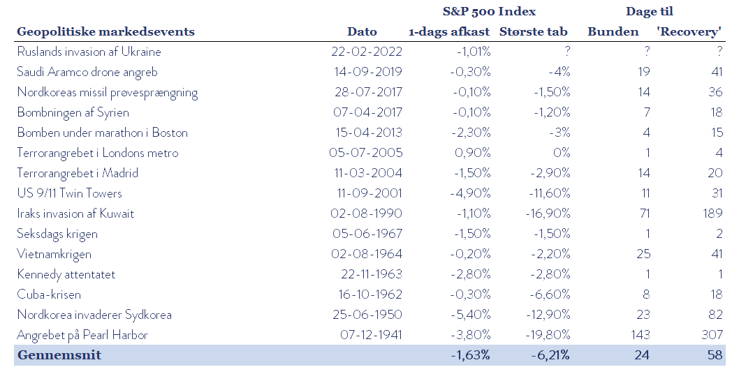 Undersøger man, hvordan historiske krige og andre geopolitiske events har påvirket markederne er følgerne i de fleste tilfælde ikke katastrofale. Det gennemsnitlige tab fra top til bund efter begyndelsen af et geopolitisk event er ”kun” 6,2%. Yderligere kan vi aflæse fra nedenstående tabel, at vi gennemsnitligt rammer bunden 24 dage efter eventet indtræffer, og allerede 58 dage senere har markedet indhentet det tabte afkast.