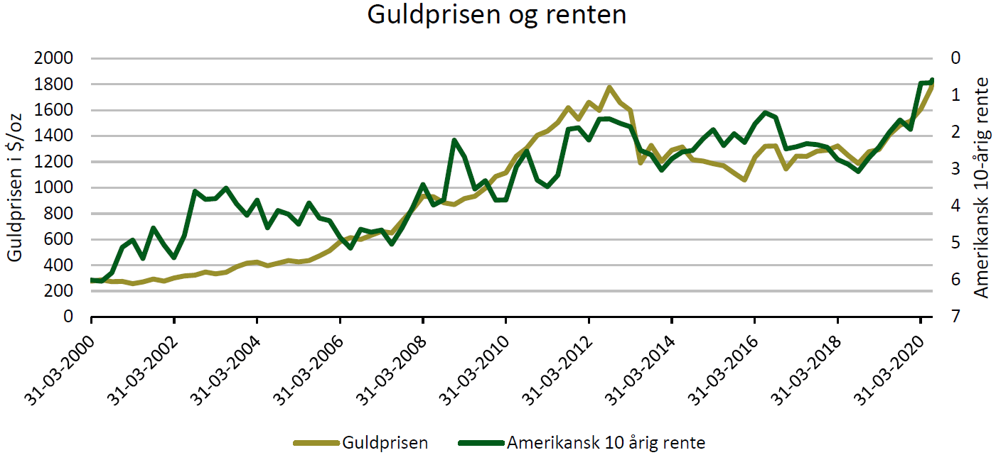 Men den mest forklarende og væsentligste faktor for guldprisen er udviklingen i renten. På grafen nedenfor ses den 10-årige amerikanske rente og guldprisens udvikling siden år 2000. Vær opmærksom på, at vi har vendt højre akse, så den stigende grønne kurve indikerer, at renten falder. Grafen viser den tydelige sammenhæng, at faldende renter har haft en meget positiv effekt på guldprisen. En faldende rente betyder, at det forventede afkast på obligationer (og kontanter) reduceres, og når renten er negativ eller omkring 0, som den er i dag, falder offeromkostningen ved at holde guld, hvilket for alvor gør aktivklassen attraktiv.