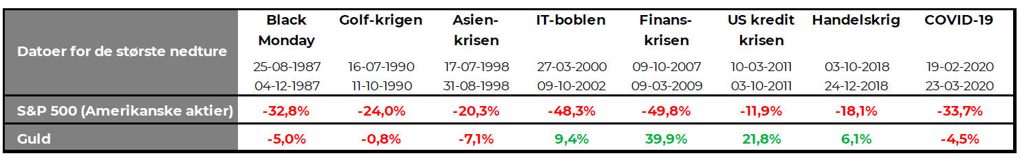 Tabellen viser, at udviklingen for guld har været bedre end aktier i samtlige af de udvalgte kriser. I 5 ud af 8 kriser har det endda givet et positivt afkast målt i danske kroner. Ser man sammenlagt på de 8 forskellige scenarier har guld et gennemsnitligt merafkast på 36,3% i forhold til amerikanske aktier.
