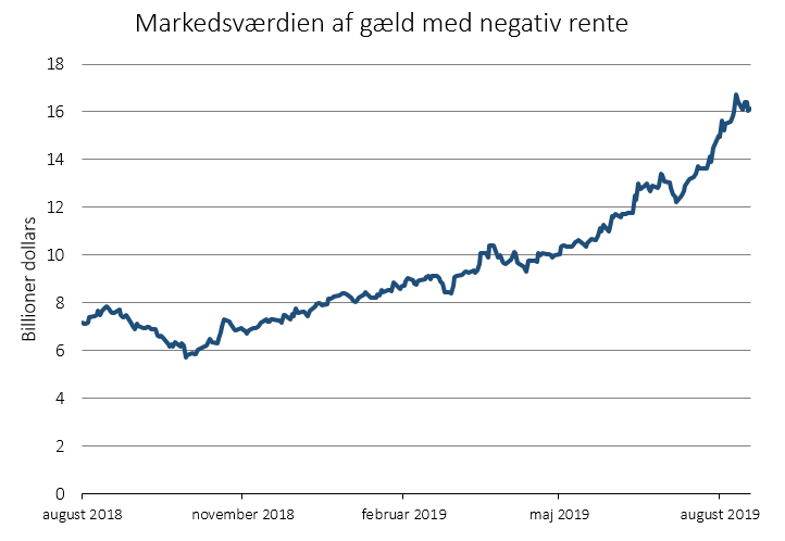 På verdensplan udgør beløbet investeret i obligationer med negativ rente pr. august måned 2019 16 billioner dollars (16.000.000.000.000 USD) svarende til ca. 25 % af det totale obligationsmarked. Et tal, som siden oktober 2018 har vokset sig tre gange så stort, hvilket virkelig understreger, hvor vigtigt det er for investorerne at have en ”sikker havn” til deres investeringer.