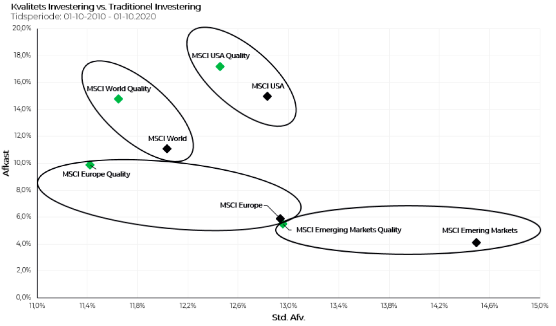 På en 10-årig horisont har kvalitetsaktier ikke blot haft et merafkast, men også haft lavere risiko målt ved standard afvigelse, og denne konklusion er gældende uafhængigt af, hvilken region der zoomes ind på. I et sådan risiko/afkast diagram er vi interesseret i at vælge de løsninger der ligger længst mod nord vest, da disse vil have det højeste risikojusterede afkast, også betegnet Sharpe Ratio.