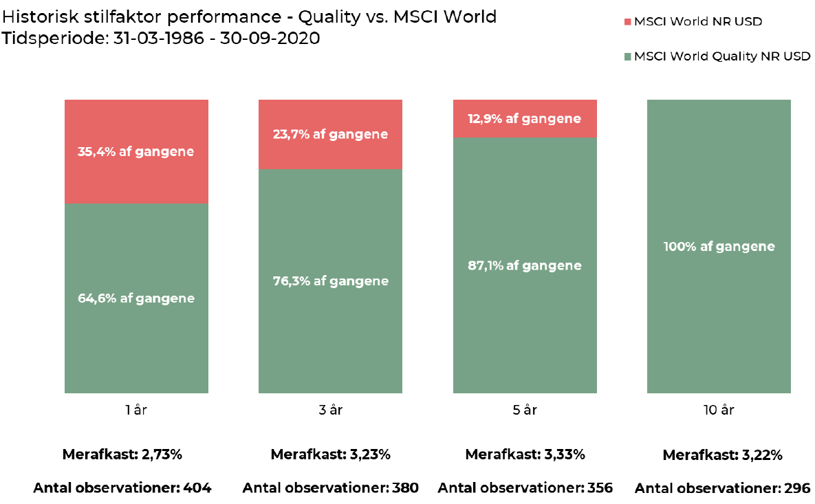 Illustrationen nedenunder viser de 1-, 3-, 5- og 10-års rullende afkast for forskellige tidslængder fra april 1986 til oktober 2020. Et rullende 10-års afkast (glidende gennemsnit) er i denne sammenhæng, at man i første periode ser på afkastet fra 1. april 1986 til 1. april 1996. Herefter er næste 10-årige rullende afkast i perioden fra 1. maj 1986 til 1. maj 1996, og så fremdeles, indtil perioden fra 1. oktober 2010 til 1. oktober 2020. Grafen viser, hvor stor en andel af gangene, hvor aktier med høj kvalitet har givet et højere afkast end aktier med gennemsnitlig kvalitet.
