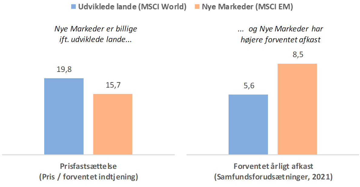 Sammen med de makroøkonomiske forudsætninger, som driver afkast på investeringer, er det væsentligt at se på egenskaber som prisfastsættelse og investeringslysten blandt andre investorer. Også her peger det i retning af en positiv udvikling for de nye markeder. Både prisfastsættelse ift. egen historik og udviklede lande er attraktiv, og der ses samtidig en stigende investeringslyst med større allokeringer til denne del af verden.