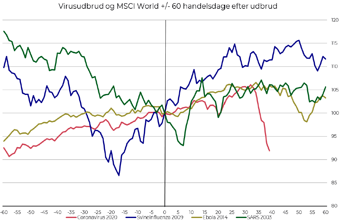 Myndigheder og centralbanker verden over ser dog ud til at være klar over, at epidemien kan ende med at have alvorlige konsekvenser for verdensøkonomien, og de har tilkendegivet, at de er klar til at stimulere markederne, hvis det viser sig nødvendigt. Den kinesiske centralbank har allerede igangsat en lang række infrastruktur investeringer og rentenedsættelser, mens både Bank of Japan samt den amerikanske forbundsbank (FED) har tilkendegivet at de også er klar til at bruge de nødvendige redskaber for forhåbentligvis at undgå en global recession. Bank of Japan har således meddelt, at de vil købe statsobligationer for 500 mia. yen for at give markedsdeltagerne likviditet og understøtte aktiemarkedet. Sammenlignes Coronavirussens indvirkning på markederne med tidligere verdensomspændende epidemier er der også håb forude. Ser man på grafen under, er det svært at spore en entydig sammenhæng. Alle tidligere epidemier ser dog ud til kun at have haft midlertidige konsekvenser.