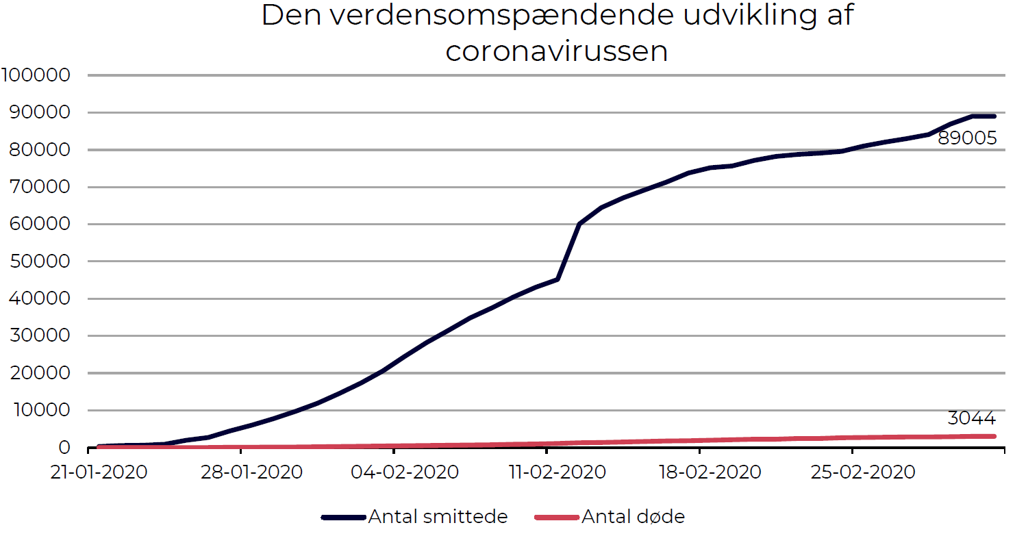 Hvor slemt står det til? Siden verdenssundhedsorganisationen, WHO, tilbage i januar rapporterede om det første udbrud af Coronavirus i Wuhan, er antallet af smittede vokset eksponentielt, og antal smittede er nu oppe på 89.000 personer. Heldigvis er antallet af døde markant lavere. Der er lige nu bekræftet 3044 døde patienter. Dette giver en dødelighed på ca. 3%. Sammenligner man dette med SARS, der udbredte sig i 2003, havde denne en dødelighed på 10%, hvorfor coronavirussen må anses som værende langt mindre farlig.