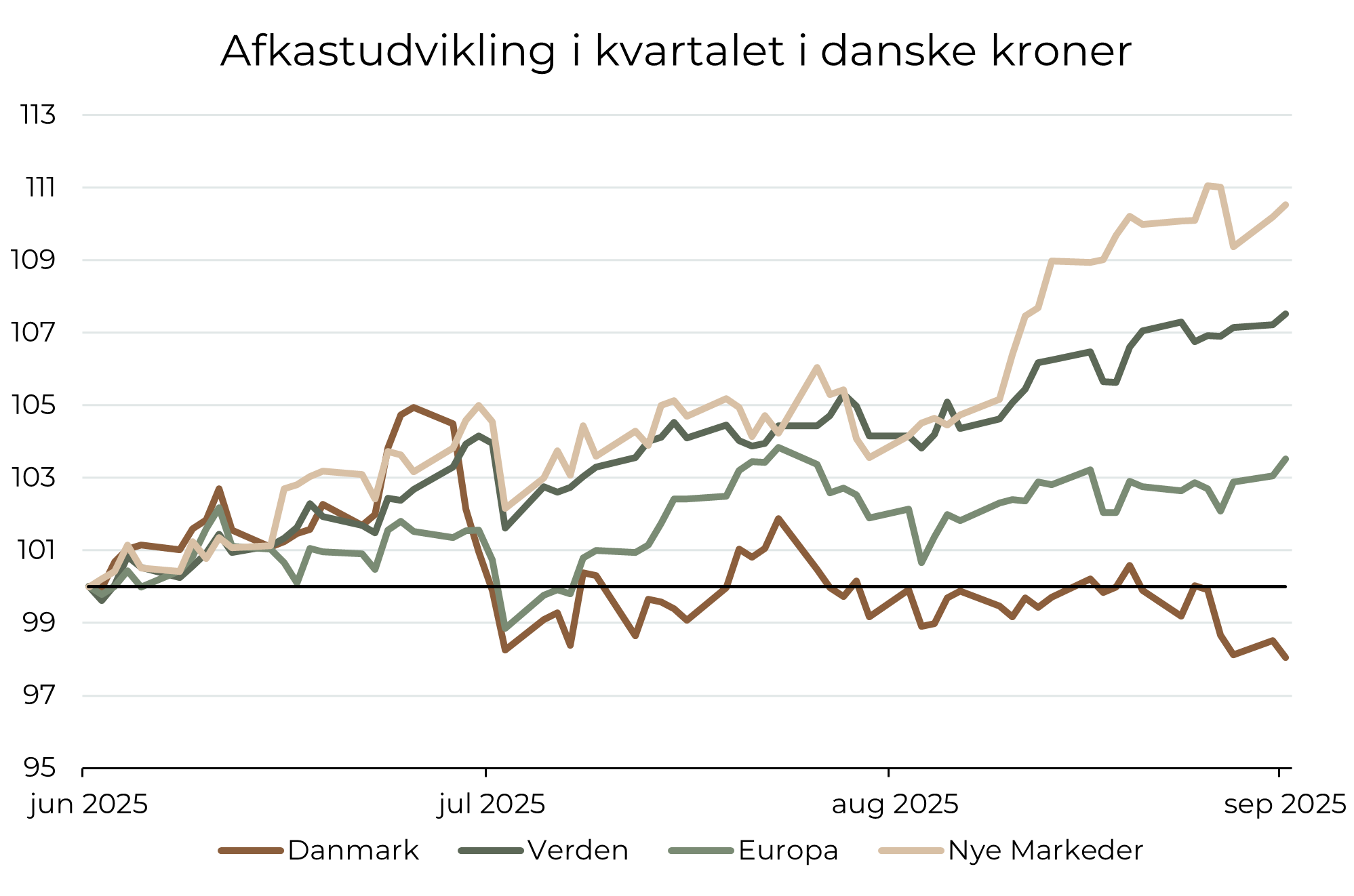 Men alligevel fortsætter de globale finansielle markeder ufortrødent og tredje kvartal blev for mange aktivklasser positivt. Globale aktier steg med 7%, europæiske aktier steg med 3,5% og udviklingslandene steg over en bred kam mere end 10%. Desværre gik de danske aktier mod strømmen med et fald på 2% i kvartalet, og Danmark er således et af de dårligst performende aktiemarkeder i verden i år – selv når vi korrigerer for Novo Nordisk!
