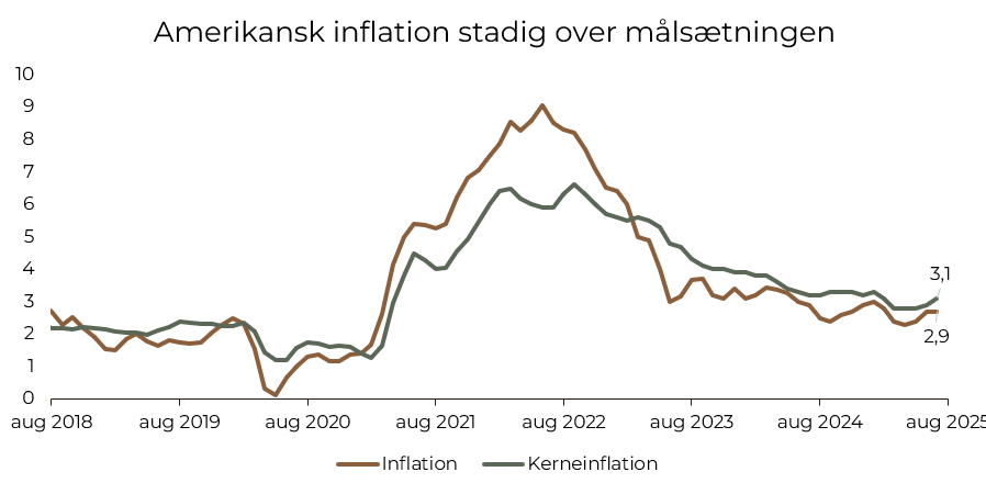 Det svage arbejdsmarked fik i september den amerikanske centralbank til at lempe renten for første gang i 9 måneder, hvilket har bragt styringsrenten ned på 4-4,25%. Netop arbejdsmarkedet var årsagen til rentenedsættelsen, da inflationen i USA stadig ligger noget over målsætningen på 2%:
