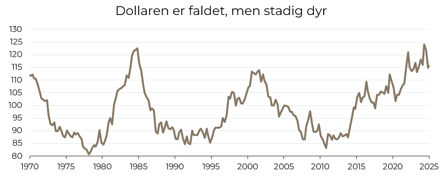 Dollaren fortsætter sit fald og er nu faldet 12% ift. danske kroner i år, hvilket har bidraget til at gøre amerikanske aktiver til en dårlig investering set fra et europæisk perspektiv. Vi forventer, at svækkelsen af dollaren fortsætter. Dollaren er stadig dyr, og Donald Trump har ved flere lejligheder sagt, at han gerne ser en svækket dollar, som kan styrke USA’s konkurrencekraft.