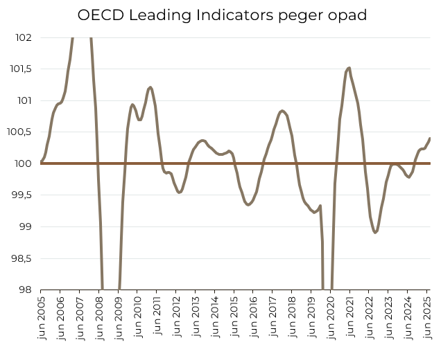 Vi har fortsat positive forventninger til de globale aktier, selvom de handler i all-time-high. OECD’s ledende indikatorer, der samler nøgletal fra industrien, arbejdsmarkedet, forbrugerne, rentemarkedet og aktiemarkedet, peger på tiltagende vækst i verdensøkonomien: