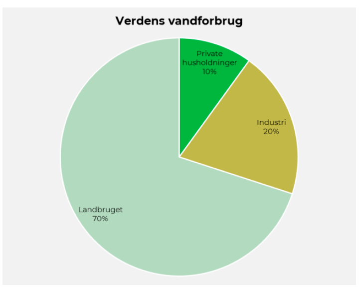 Analyseres det globale vandforbrug, så drikker vi mennesker i gennemsnit ca. 2 liter vand om dagen. Hertil kommer forbrug til mad og rengøring, som tegner sig for ca. 10 % af vores samlede vandforbrug. Derudover bliver godt 20 % brugt af en bred vifte af fabrikker og virksomheder til brug for de produkter vi køber. De resterende godt 70% af vores samlede vandforbrug bliver brugt af en enkelt industri: Landbruget.